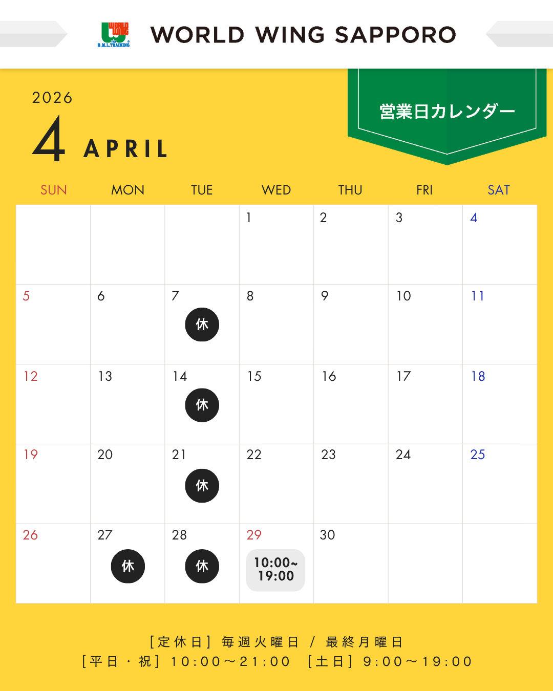 【4月休館日・営業時間変更のお知らせ】